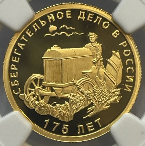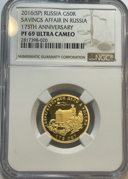 Золотая монета 50 рублей "175-летие сберегательного дела в России" 7,78г., СПМД, 2016г. В СЛАБЕ NGC PROOF 69 ULTRA CAMEO