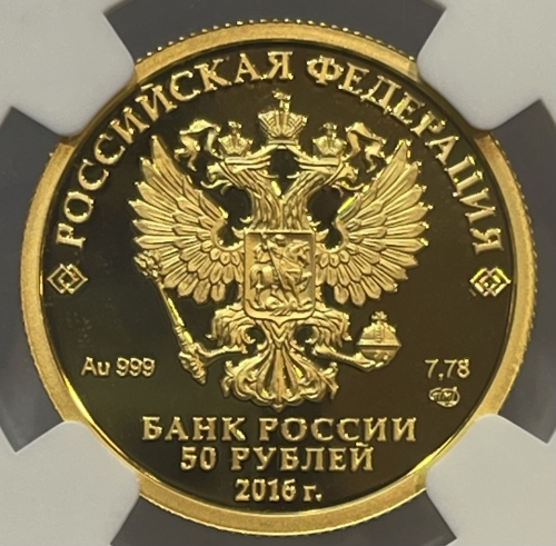на зеркальном поле диска – рельефное изображение Государственного герба Российской Федерации, над ним вдоль канта – надпись полукругом: "РОССИЙСКАЯ ФЕДЕРАЦИЯ", обрамленная с обеих сторон сдвоенными ромбами, внизу под гербом: слева – обозначения драгоценного металла и пробы, справа – содержание химически чистого металла и товарный знак монетного двора, внизу в центре в три строки – надпись: "БАНК РОССИИ", номинал монеты: "50 РУБЛЕЙ", год выпуска: "2016 г.".